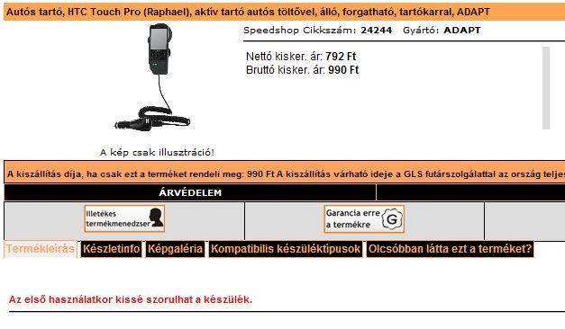 Utoljára 2,5 éve vásároltam tőlük és mivel 3000 pontom volt a virtuális kártyámon (1400 pontot azért kaptam anno, mert visszaküldtem egy headsetet, mivel tévedésből mást küldtek és úgy döntöttek, hogy nem visszautalják, hanem rátolják a kártyámra), azért gondoltam most hogy szükségem van egy aktív autós tartóra, elköltöm rá és még pénzembe se kerül. [Plusz info, hogy 2007 előtt több mint 140eFt-ot elköltöttem náluk (egy laptop is lett vásárolva innen).] Hohóó! Nem úgy van ám az! Gondoltam, hogy a futárköltség nem számítható bele, ezért MSN Suporttól megkérdeztem, hogy így van-e. Természetesen így. De úgy voltam vele, hogy még úgy is megéri. Így a választásom egy FORGATHATÓ (fontos volt hogy fektetve bele tudjam tuszkolni a telefont a navigáció miatt) aktív autós tartóra esett, ami 990Ft-ért volt meghirdetve:     Természetesen megnéztem a képeket, hogy mégis mi az, hogy forgatható... Itt látható:           Hát el is döntöttem, hogy megveszem, mert pont ilyen gömbcsuklós cuccot kerestem.   Ma megkaptam a "gyorsbolt" által forgalmazott olcsóságot. Nézzük:   1. Bontott csomagolás (ez még nem is lett volna baj, ha az van benne amit rendeltem) 2. Némmá' a gömbcsukló nem is gömbcsukló:       Nem csak, hogy nem az, hanem a gyári csomagoláson jelzett ADAPT márka helyett egy ARKON felirat figyel a tartókar "csatján":       Próbáltam felrakni a szélvédőre úgy, hogy vízszintes helyzetben legyen a telefon, de elég idiótán néz úgy ki... Inkább maradt a jól bevált reklamáció. MSN-en rájuk írtam, hogy lehet-e reklamálni MSN-en (digitális kor :) ). Bizony lehet, ennyit még megengednek. Amikor írtam mi a problémám, közölte, hogy a kép csak illusztráció és, hogy a munkatársa csak ilyen képet talált róla. Ja kérem igen, csakhogy a képek az eredeti termékről készültek és csak utólag lett kicserélve a tartókar (az ügyfélszolgálatos szerint a raktárban is ugyanilyen tartóval van, ami egy kicsit vicces, hogy nem ez van felrakva, mivel ez NEM FORGATHATÓ). Ennyi erővel így el lehet eladni egy 3210-est az N90-es képével, hiszen mindkettővel lehet telefonálni és a kép is csak illusztráció. Ezek után korrekten felajánlotta, hogy 8 napig vissza tudom küldeni és visszarakják a pontokat a kártyámra. Namármost. A postaköltség visszafele 530Ft lenne ajánlva, plusz még rendelnem kellene tőlük, hogy a visszaírt pontokat levásárolhassam megint, viszont akkor megint ki kell fizetnem a futárköltséget. Tehát összefoglalva küldjek vissza egy 990Ft-os cuccost, hogy 1530Ft-ot fizethessek postázásra és futárra :D Jó üzlet... csak nem nekem. A kedves ügyfélszolgálatos (V. Krisztián), akinek kifejtettem ezt a problémát, nemes egyszerűséggel letiltott MSN-ről 11:44-kor és eddig nem jött fel (15:00). Nem hiszem, hogy csak miattam kijelentkezett volna, hiszen az a többi ügyféllel való kommunikációt is kizárja... Egyébként ezt a békát lenyeltem volna, mivel nem egy nagy értékű cuccról van szó, de ezzel a paraszt lépésével betelt a pohár. Beszélgetés közben letiltani (mert még csak nem is írtam semmi sértőt és személyeskedőt), ez aztán a problémamegoldás. Újfent köszönöm Speedshop, megint rájöttem, hogy ez még mindig Magyarország! A régi hibátokból csináltatok egy újat! Igazán profi cég immár 11 éve... mínusz egy vevővel.   Frissítve: egészen biztos, hogy letiltott, mert ma (2010.04.08) se volt fenn az ügyfélszolgálatos, annak ellenére, hogy minden munkanap fenn szokott lenni. Köszönöm!